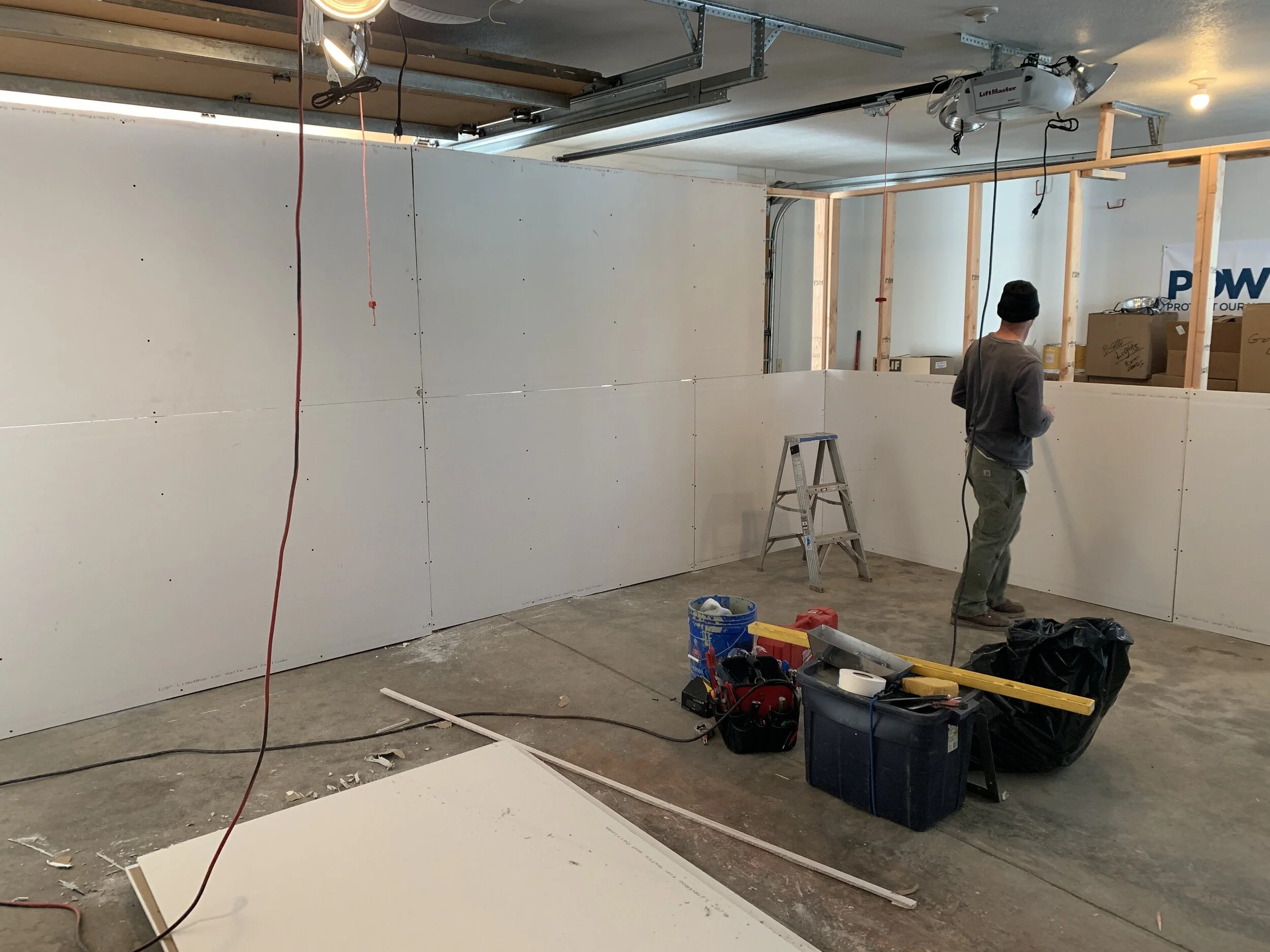 After the art selection was finalized and printed, three of the images, along with the tree camo design, were printed onto four hand-built snowboards, thus becoming the presentation focal point. Next up was creating a space within a two-car garage to place the artwork, snowboards, and product. Initially I wanted to cover up the fact that the presentation space was in a garage, but ultimately settled on the idea that it would be another talking point about a proper gallery actually being in a two-car garage, at a house party. Once the space was measured out and materials procured, the walls went up, paint applied, floor wrapped, artwork hung, all in the span of three days.